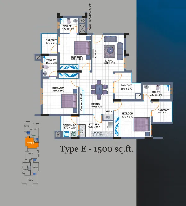 Independent three phase wiring including ELCB & MCB, 2 light points and one fan point in each room, Exchaust fan provision in kitchen and toilets, Switches – Modular type, 5 nos. 5A sockets in each apartment, 2 nos.15A sockets in each apartment, Provision for TV connection. Provision for washing machine. Provision for internet connection.